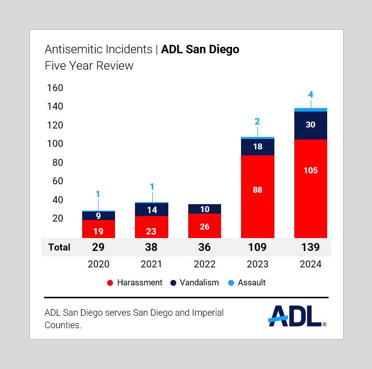 The Anti-Defamation League of San Diego has recorded a significant jump in the number of local antisemitic incidents in recent years.